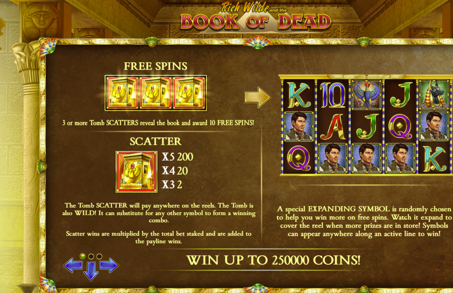 The highest-paying symbol is Rich Wilde, followed by the Egyptian gods. If one of these is chosen at the start of free spins, the potential for huge wins is dramatically increased.